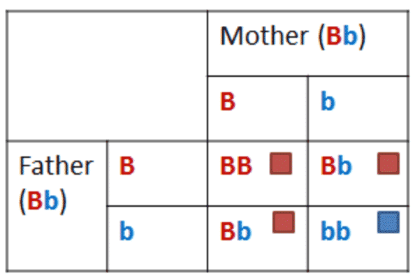 Some of the most important work on heredity and genomics was completed by Gregor Mendel using pea plants. By breeding multiple generations of plants, he observed that certain alleles are dominant while others are recessive. To make this really clear, let’s go back to the example of human eye color. A brown-eyed male and a brown-eyed female produce a child. In each of their genetic material, the brown eye allele is dominant, but they also both possess the allele for blue eyes as recessive. Because both parents carry the blue eye allele, there is a chance their child will have blue eyes, but it’s not very likely. The Punnett square below illustrates the possible phenotypic outcomes for eye color in this circumstance.