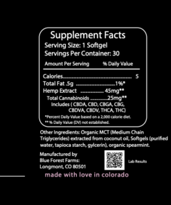 There are a lot of CBD brands out there but Blue Forest Farms has it down. Very high quality process and ingredients and love that they grow the hemp organically in Colorado. The 07 soft gels are great because I don’t like taking an oil tincture. They seem messier to me and the soft gels are super easy. The 07 is the most natural oil in their line. I love it!