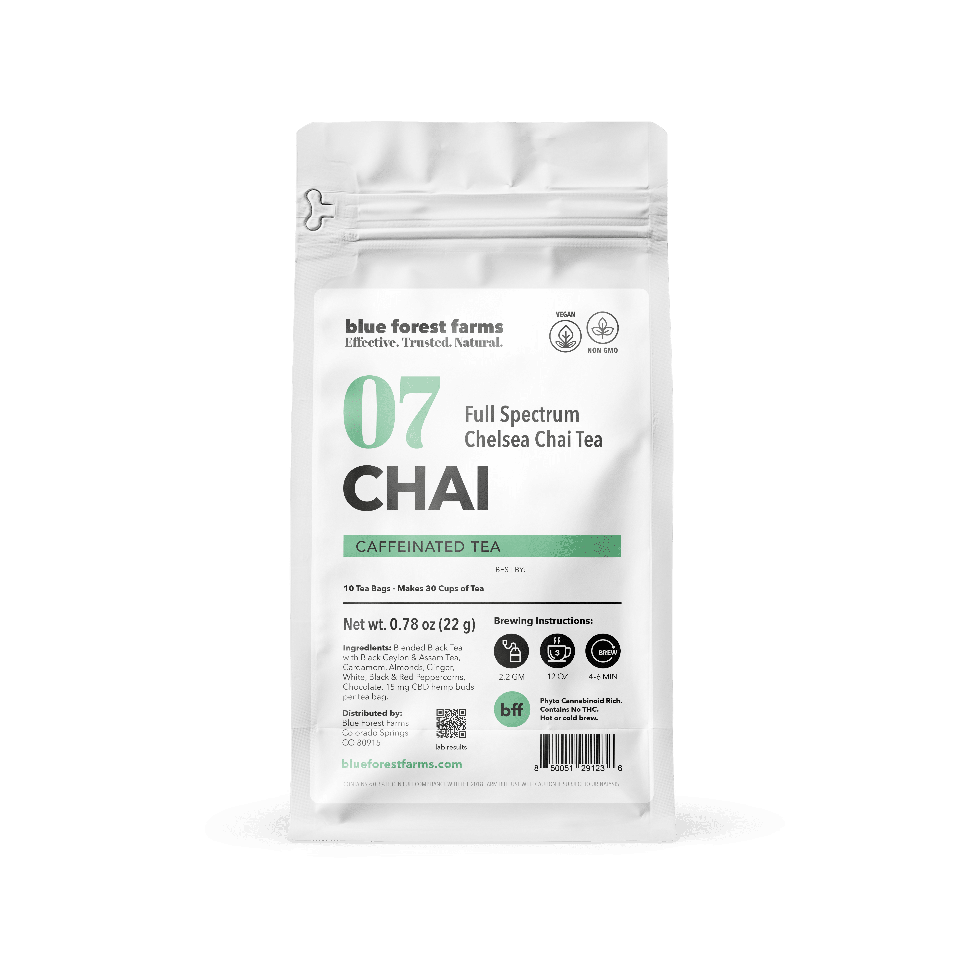 Black Ceylon & Assam Tea, Cardamom, Almonds, Ginger, White, Black & Red Peppercorns, Chocolate, and 15 mg CBD hemp buds per tea bag